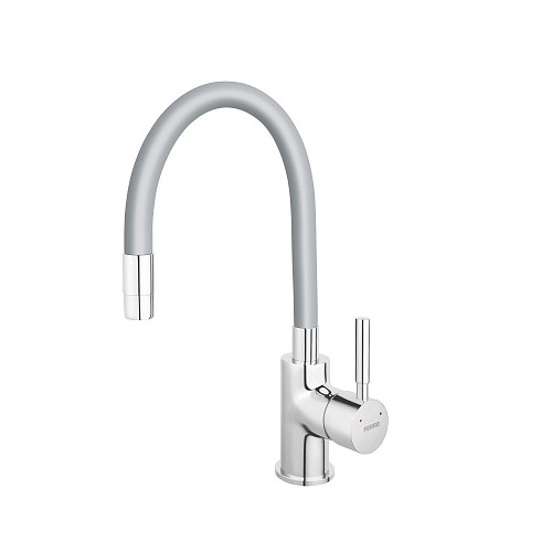 Смеситель кухонный, гибкий носик, серого цвета, форма сливного шланга может быть гибко изменена, глубина различной толщины от 150 мм до 350 мм.