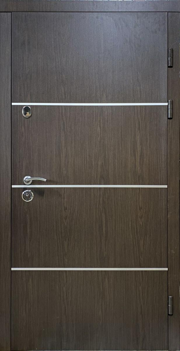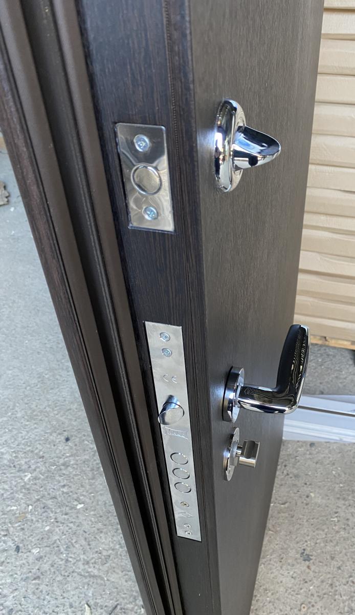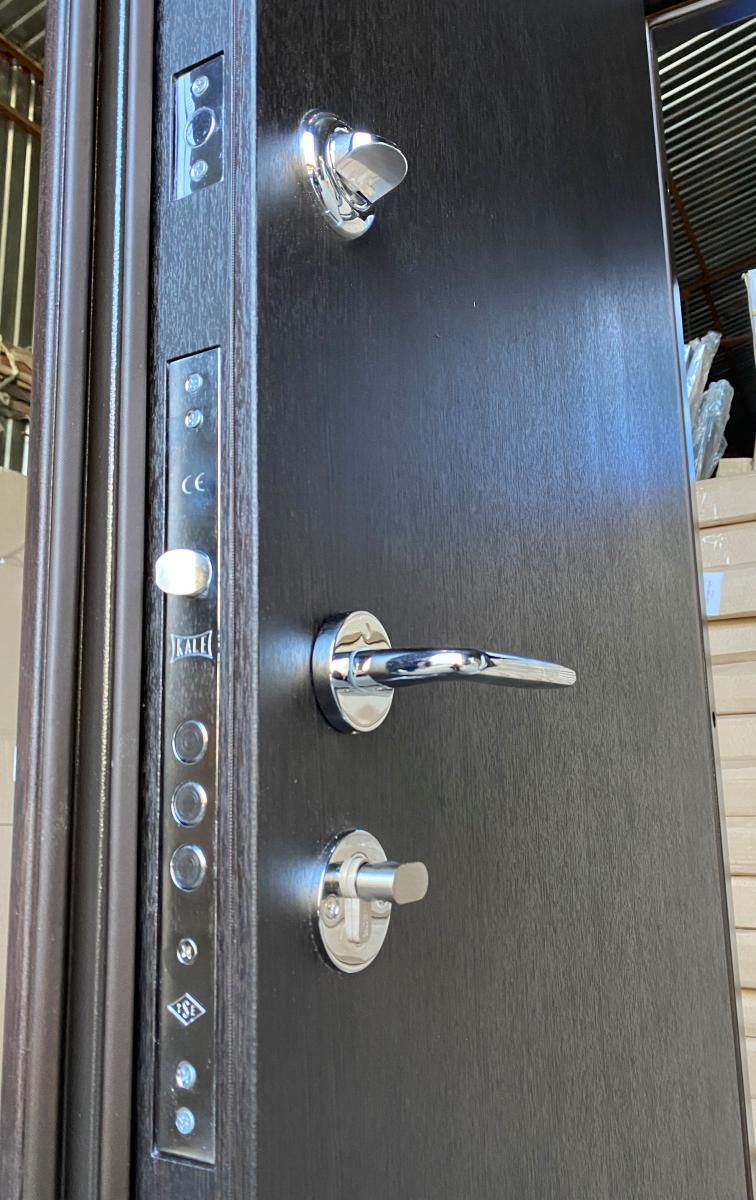 Розміри (ширина*висота) 860*2040 Колір Сублімація Венге + 3 молдинги/Венге південний (вулична) Накладки* сендвіч-панель 12 мм (сублімована сталь 1мм+пінополістирол 10 мм) / мдф 10 мм Товщина металу полотна* 1,5 мм Товщина полотна* 90 мм Наповнення полотна* мінвата Товщина коробки* 120 мм з терморозривом (утеплений мінватою) Фурнітура* 3 зовнішні петлі, утоплена боненакладка, ручка на розетці АФІНА, антизрізи, Торець полотна зашитий МДФ, нічний засув, поріг з нерж.сталі ЗАМОК Верхній* "Сейфовий KALE 252" ЗАМОК Нижній* "Циліндровий KALE 257 + циліндр KALE "