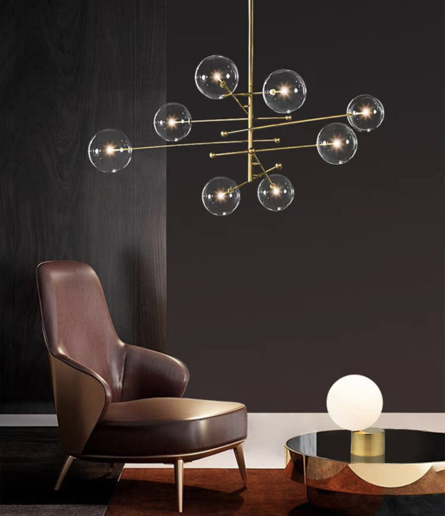 Підвісна люстра на штоку BOWL GOLD – BUBBLE CLEAR виконана в золотому каркасі з плафонами зі скла у прозорому кольорі . Мінімальна висота 75 см. , Діаметр 120 см . Висота люстри регулюється за рахунок штока