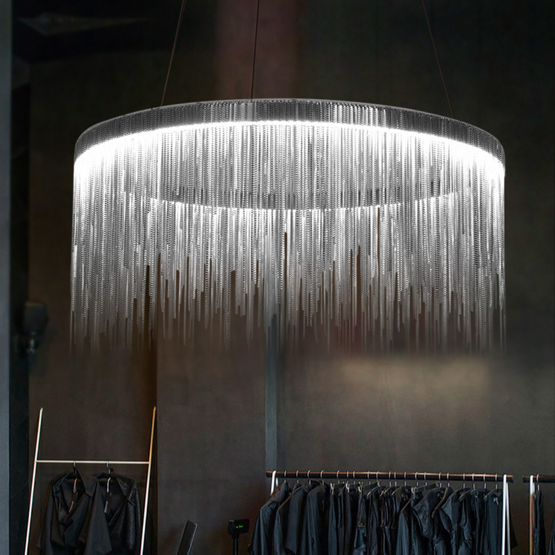 Тросова люстра CIRCLE D – 800 виконана з металевого каркасу з навішуванням з металу в кольорі хром . Мінімальна висота 60 см. , Діаметр 80 см . Висота люстри регулюється за рахунок тросів.