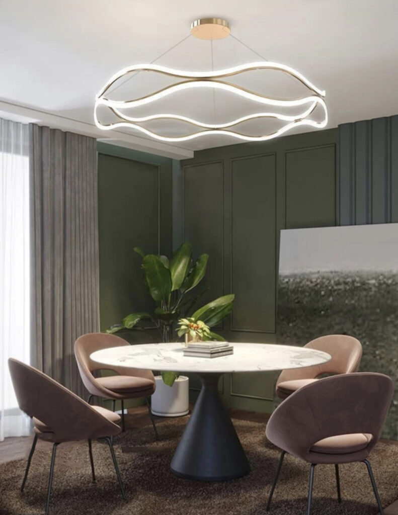 Тросова серія люстр Led Rims виконана з металевого каркасу в золотому кольорі з вбудованим Led на 190 ват. Діаметр 80 см., Мінімальна висота ваги 40 см., максимальний опуск 1,5 метра.