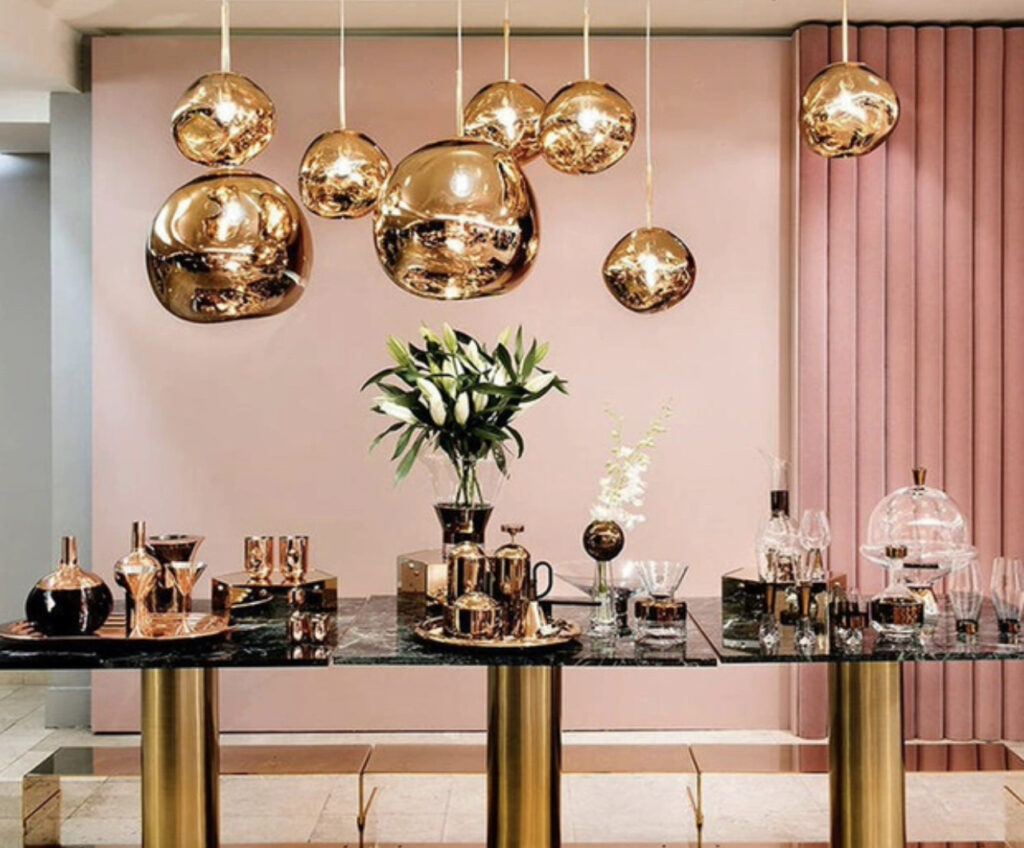 Підвісна люстра MELT виконана з металевого каркасу та плафону з акрилу в кольорі золото. Діаметр 40 см., Мінімальна висота ваги 50 см., максимальний опуск 1,5 метра.